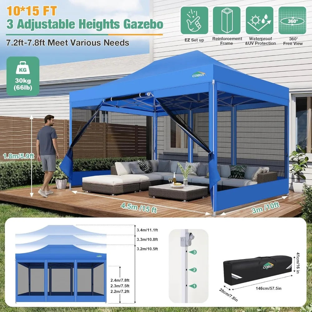 - Waterproof and Mosquito-Proof: This 10x15 Pop up gazebo features one top canopy and 4 removable mesh sidewalls. The 10x15 canopy tent is made from UV-resistant 420D Oxford fabric, blocking 99% UV rays. The canopy with PU coating and upgraded seam tapes ensure water resistance. The canopy with netting not only protects you from mosquitoes but also provides ventilation during the hot summer months.