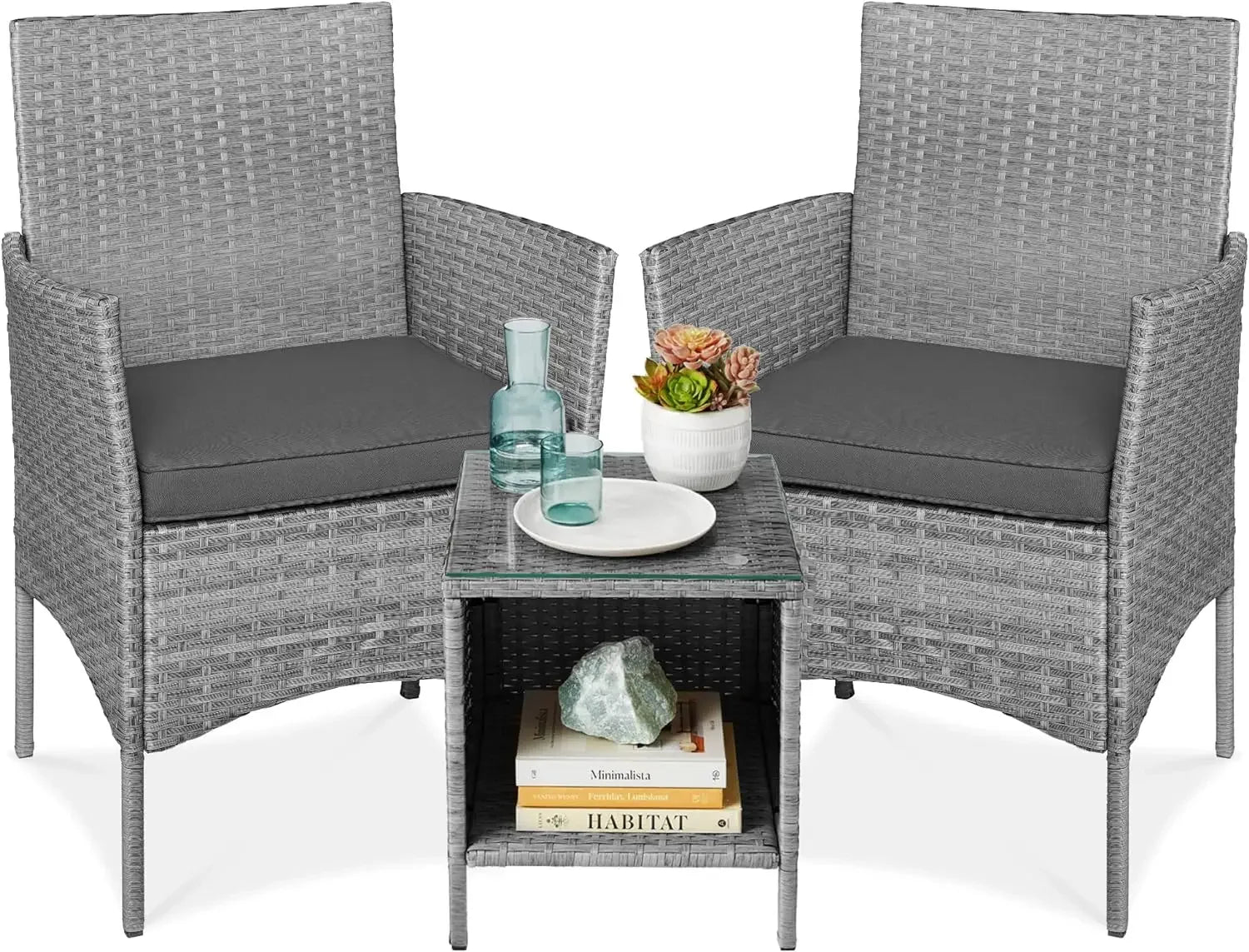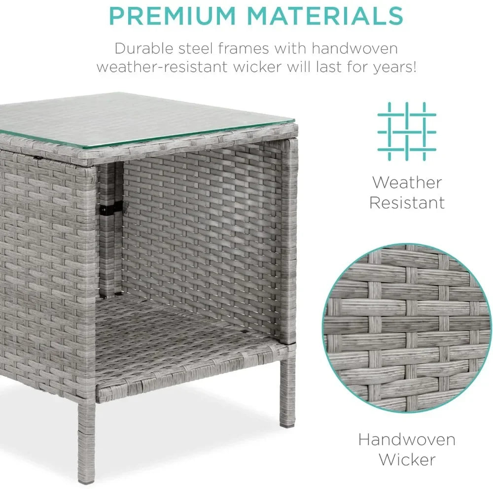 PREMIUM MATERIALS: All-weather wicker on a durable steel frame guarantees long-lasting, high-quality seating; CHAIR DIMENSIONS: 23"(L) x 21.75"(W) x 32.25"(H); TABLE DIMENSIONS: 15.5"(L) x 15.5"(W) x 17.75"(H); Chair Weight Capacity: 250 lbs.; Table Weight Capacity: 50 lbs.