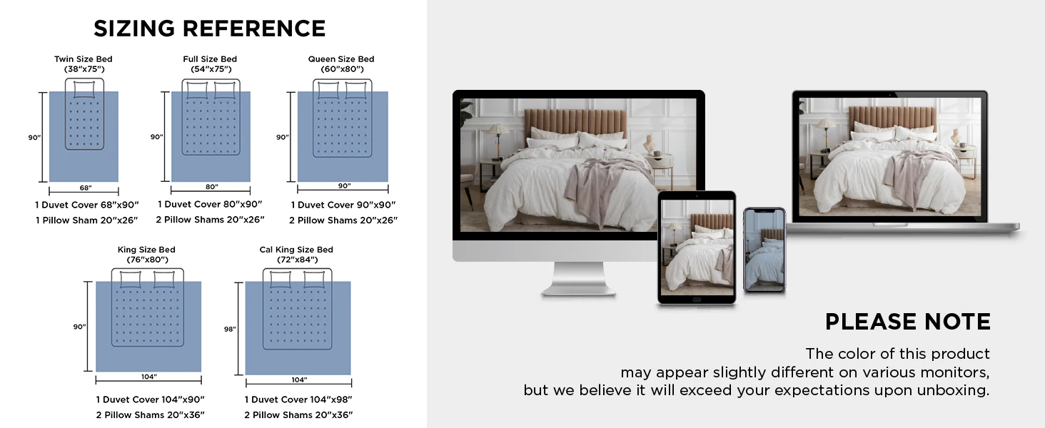 What You Get: This Bedsure cotton cal king duvet cover set comes with 1 duvet cover (104" x 98") and 2 pillow shams (20" x 36").