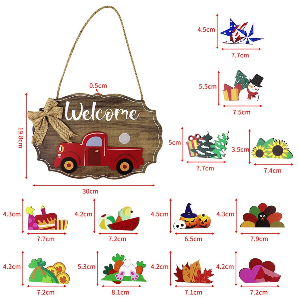 * The package includes: you will receive a wooden sign with a lanyard with the word welcome printed on it, a 3D red pickup truck and 12 different interchangeable signs, which can be changed as you like. Each piece is affixed with adhesive, which can be easily switched, and you can also get a black and white plaid bow, which can decorate your sign more beautifully.